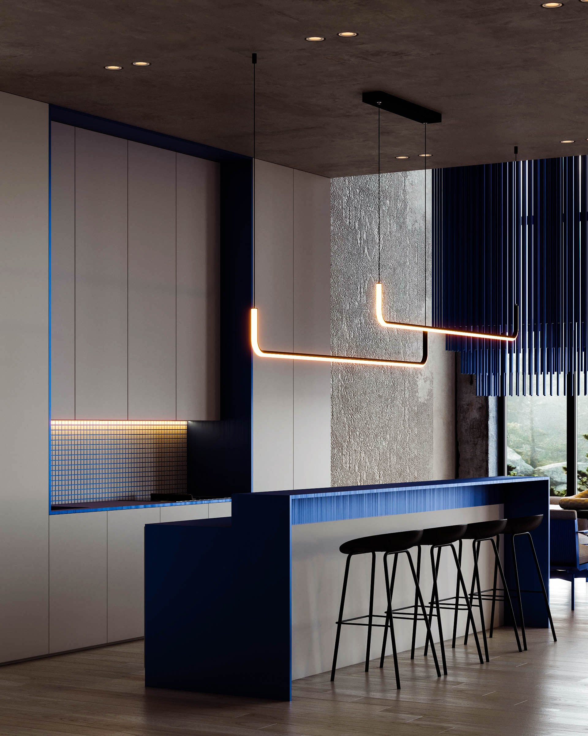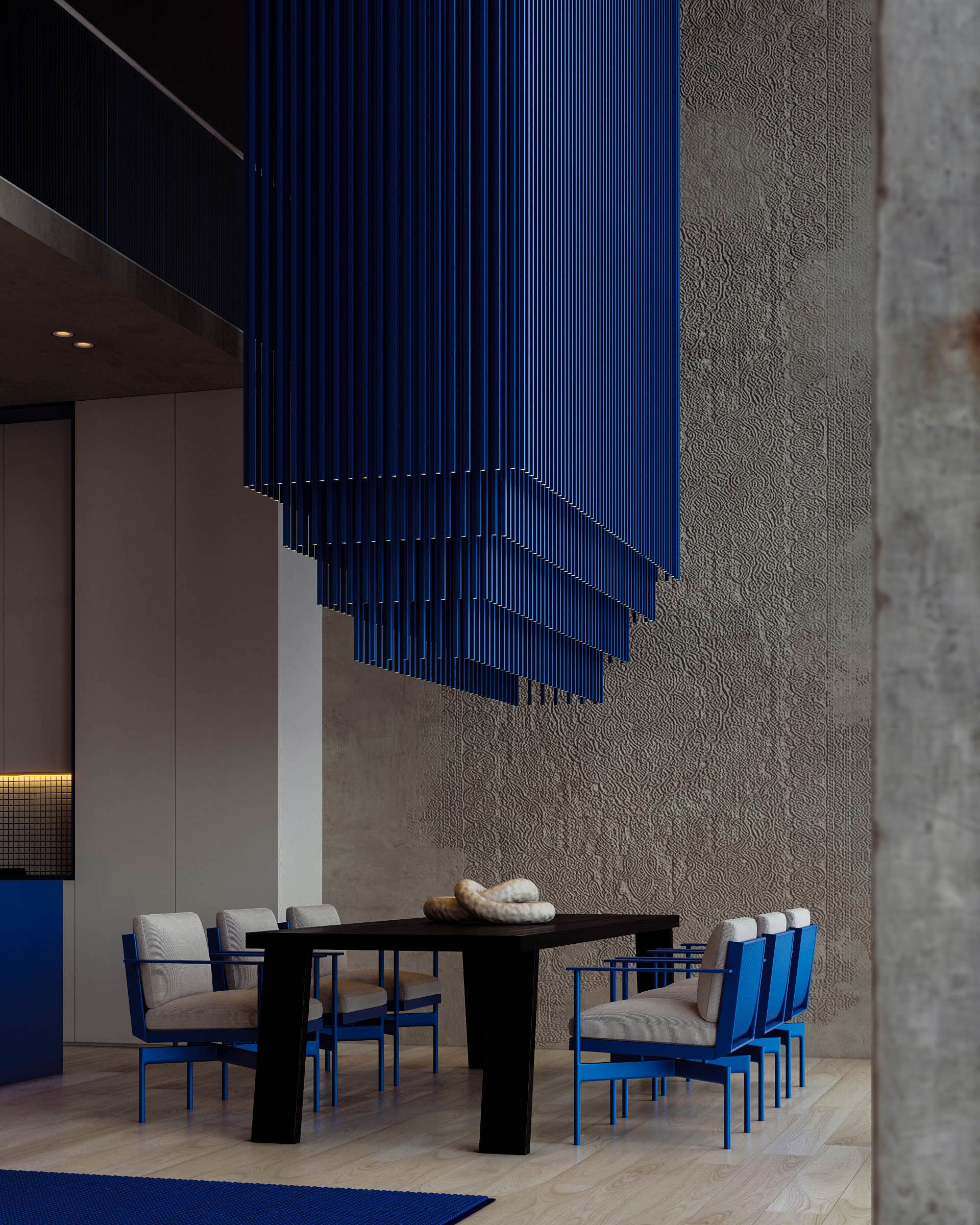 Разработка 3д анимации и концепт дизайна кухни-гостиной в стиле минимализм с использованием яркого акцентного цвета и арт-объектов